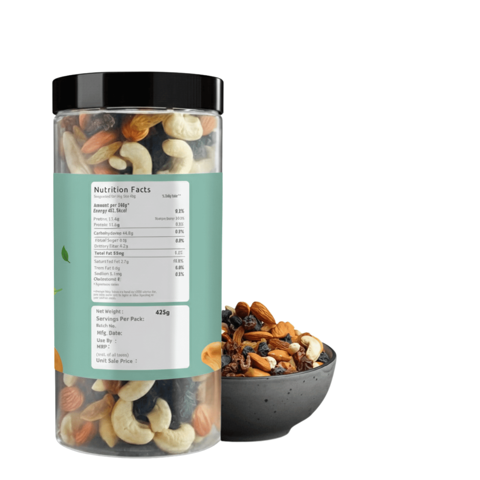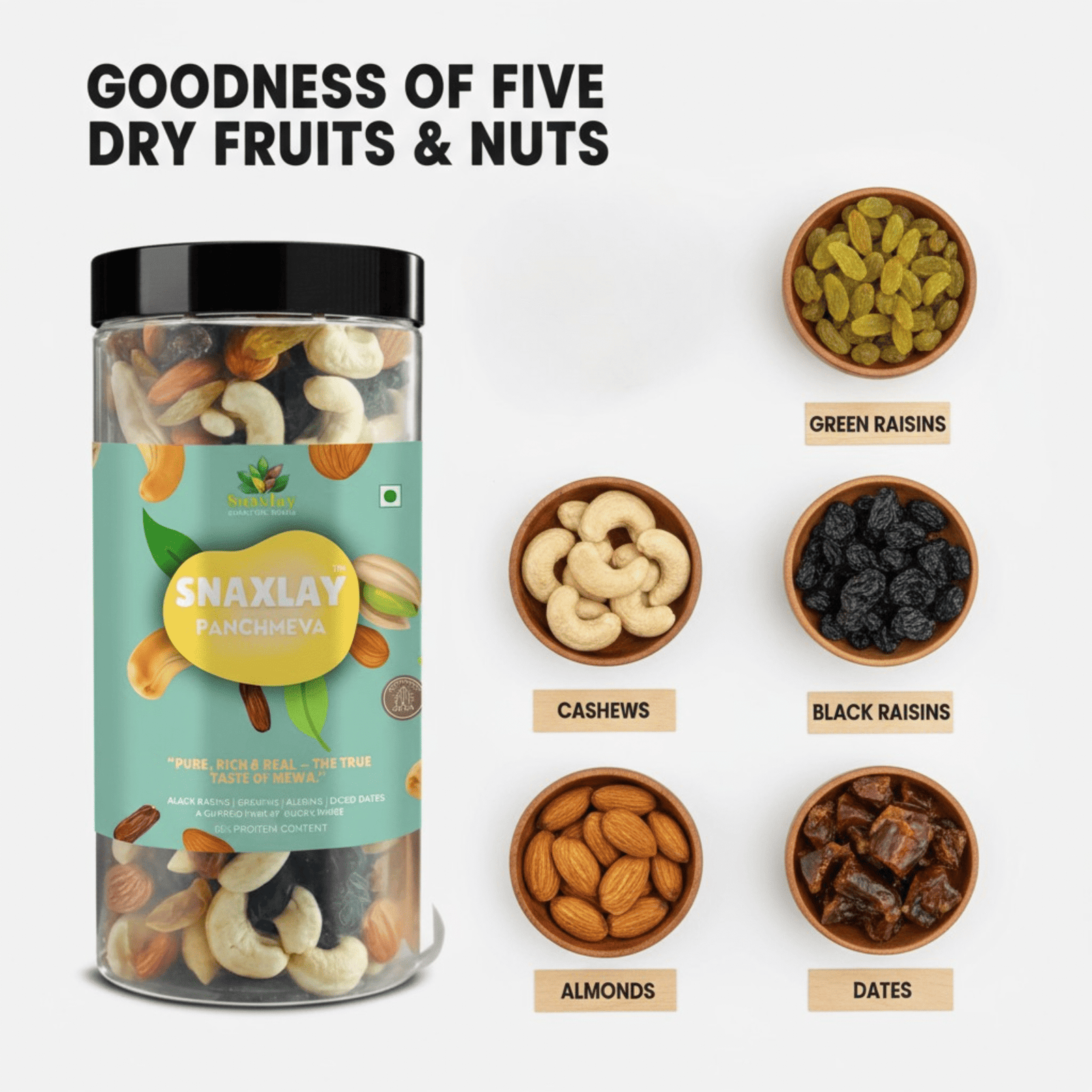 Snaxlay Panchmewa 425g brings together the 5 treasures of health and taste — crunchy cashews, nutritious almonds, golden and black raisins, and naturally sweet dates — all in one premium mix.