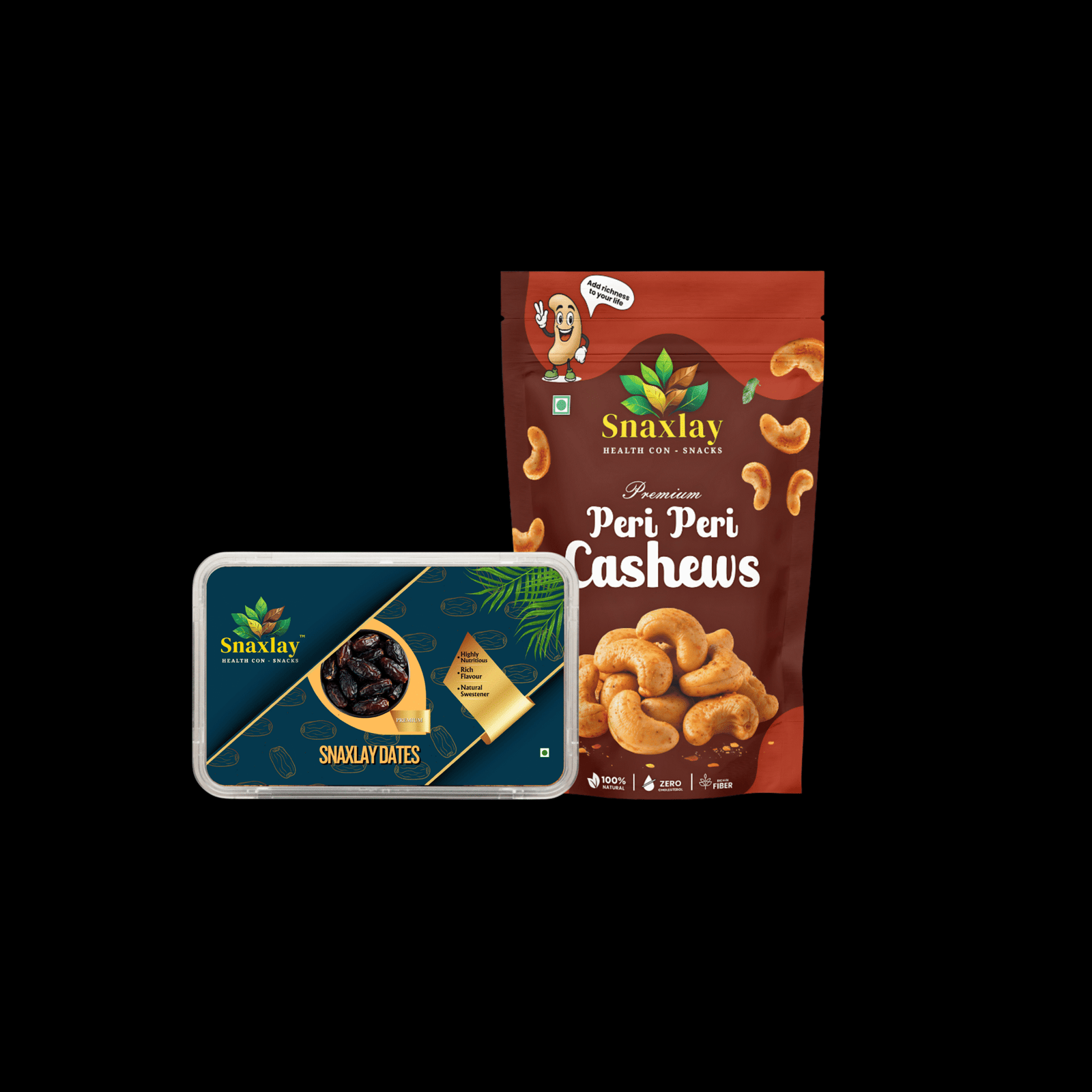 Enjoy the bold taste of Snaxlay Peri Peri Cashews paired with the natural sweetness of Soft Arabian Dates in this premium combo pack. A perfect mix of spicy, crunchy cashews and juicy, fiber-rich dates, crafted for snack lovers who want both flavour and nutrition.